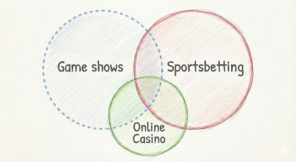 There are many forms of gambling in the world, both online and offline. Some people bet on sports. Some play table games or slots. Others play bingo. Some pay in to prize drawings. Some buy scratch cards or lottery tickets. Not every player is interested in every game type. Different types of gambling have different cohorts of potential players, and game shows are likely to have substantially distinct populations of potential players from casino-style games and sports-betting.